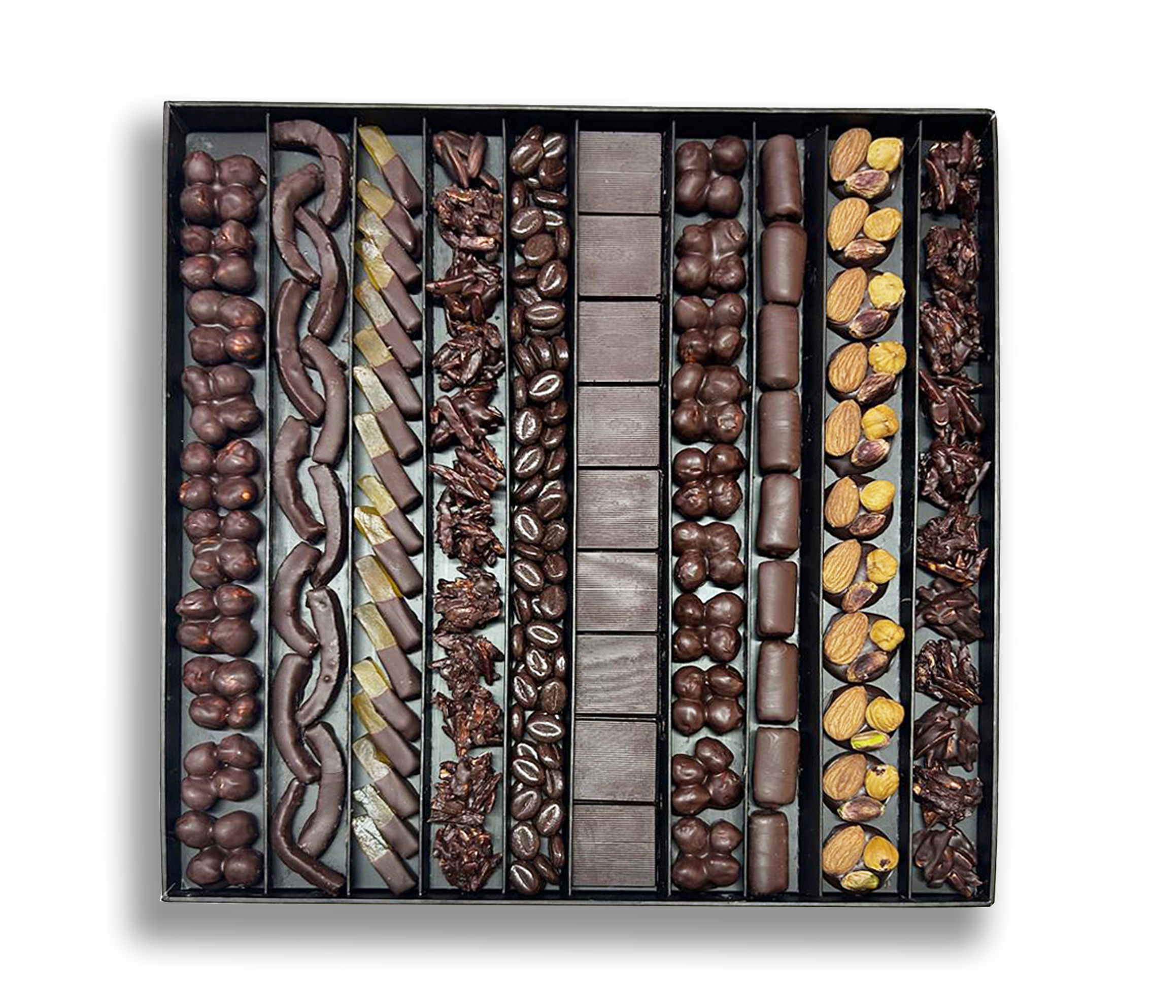 Maya Kanaan In Christmas BOÎTE TOUT VEGAN Sélection de délices enrobés de chocolat noir Grand Cru 70%. 800 gr