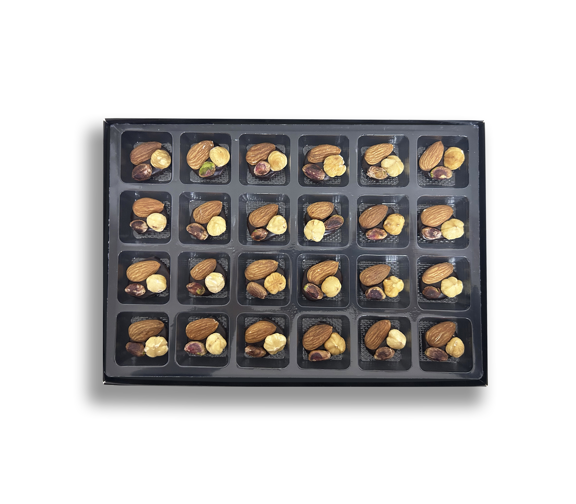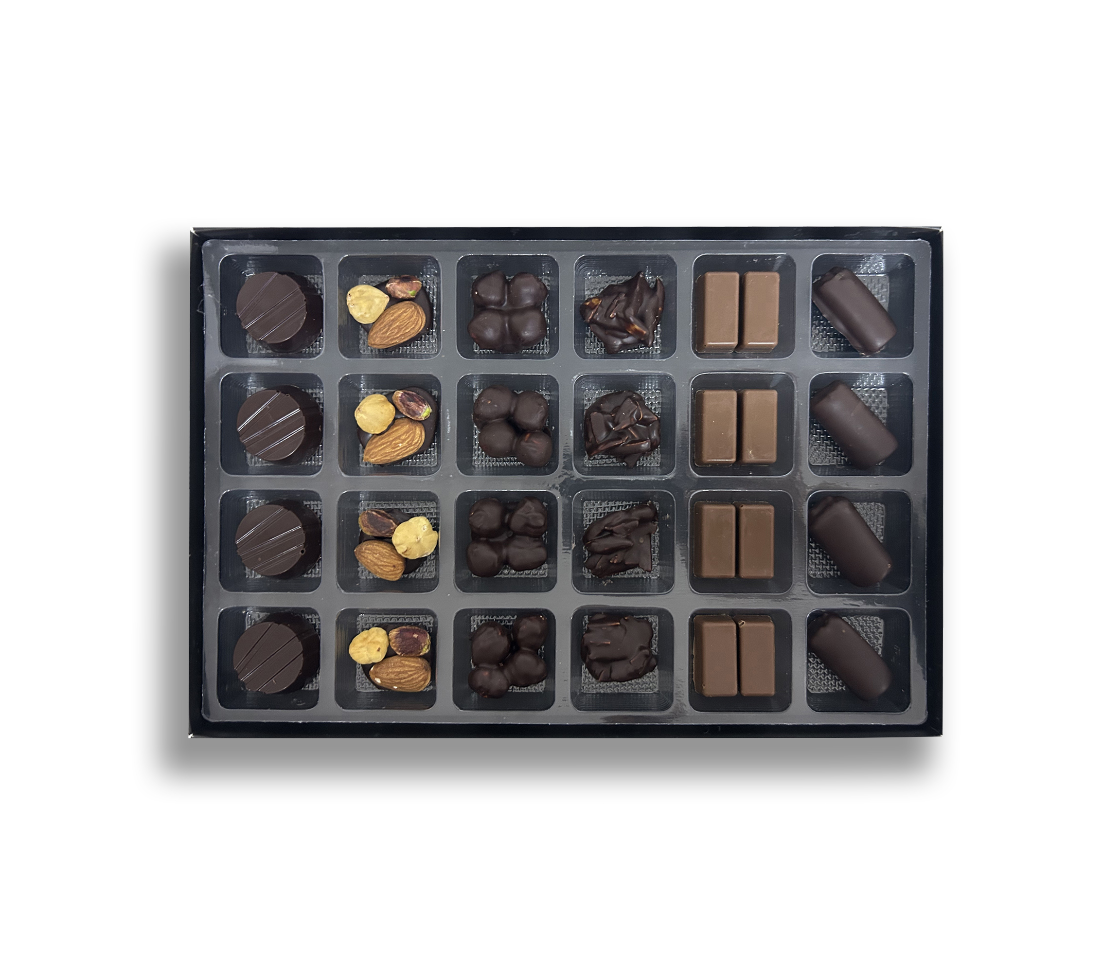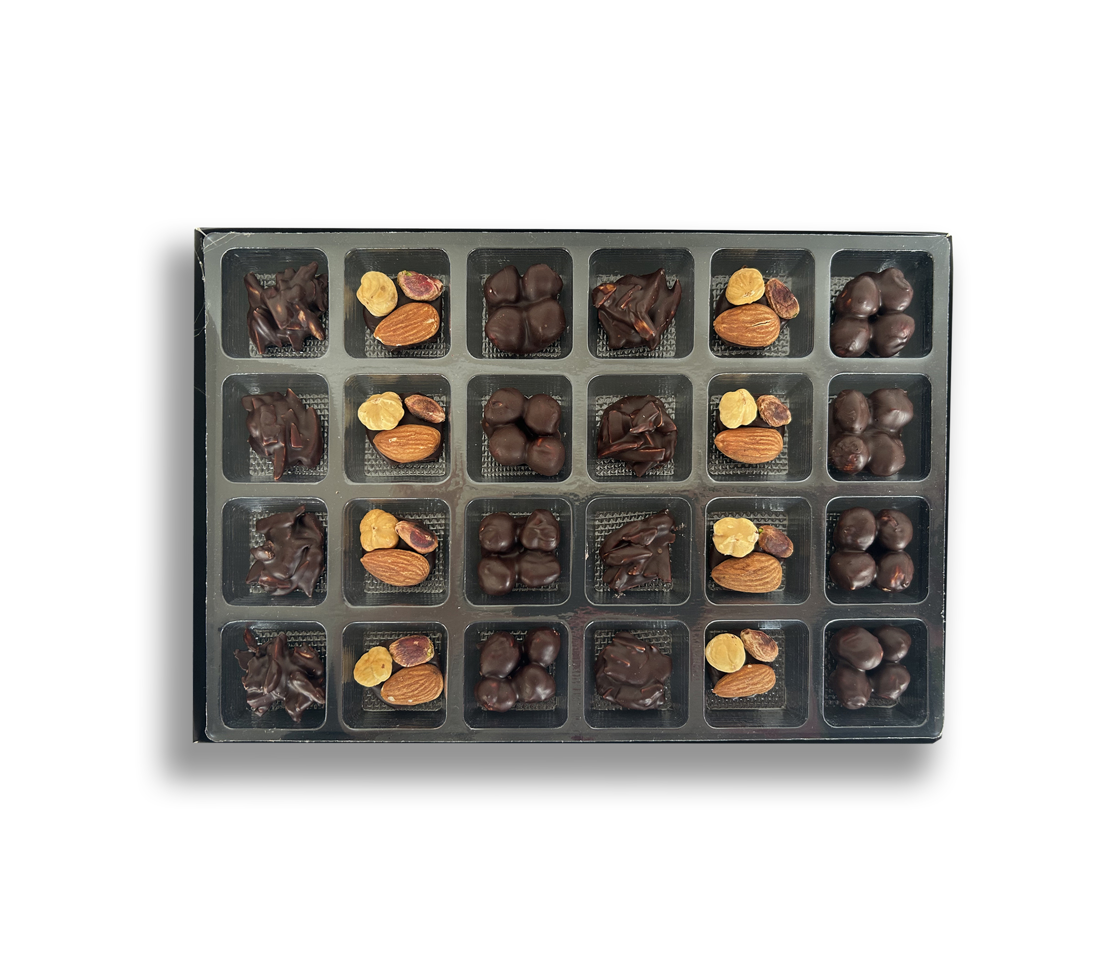 Maya Kanaan In Christmas BOÎTE VEGAN 24 PIÈCES Noisettes, amandes et mendiants. Le parfait mariage entre les fruits secs et notre bon chocolat noir.
