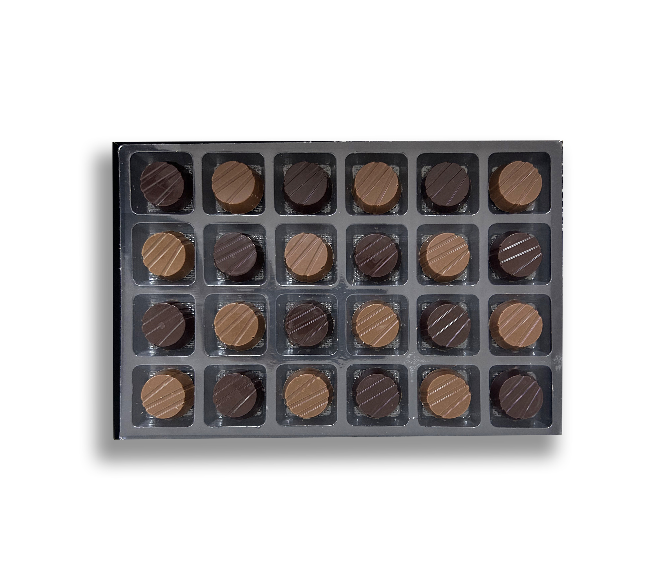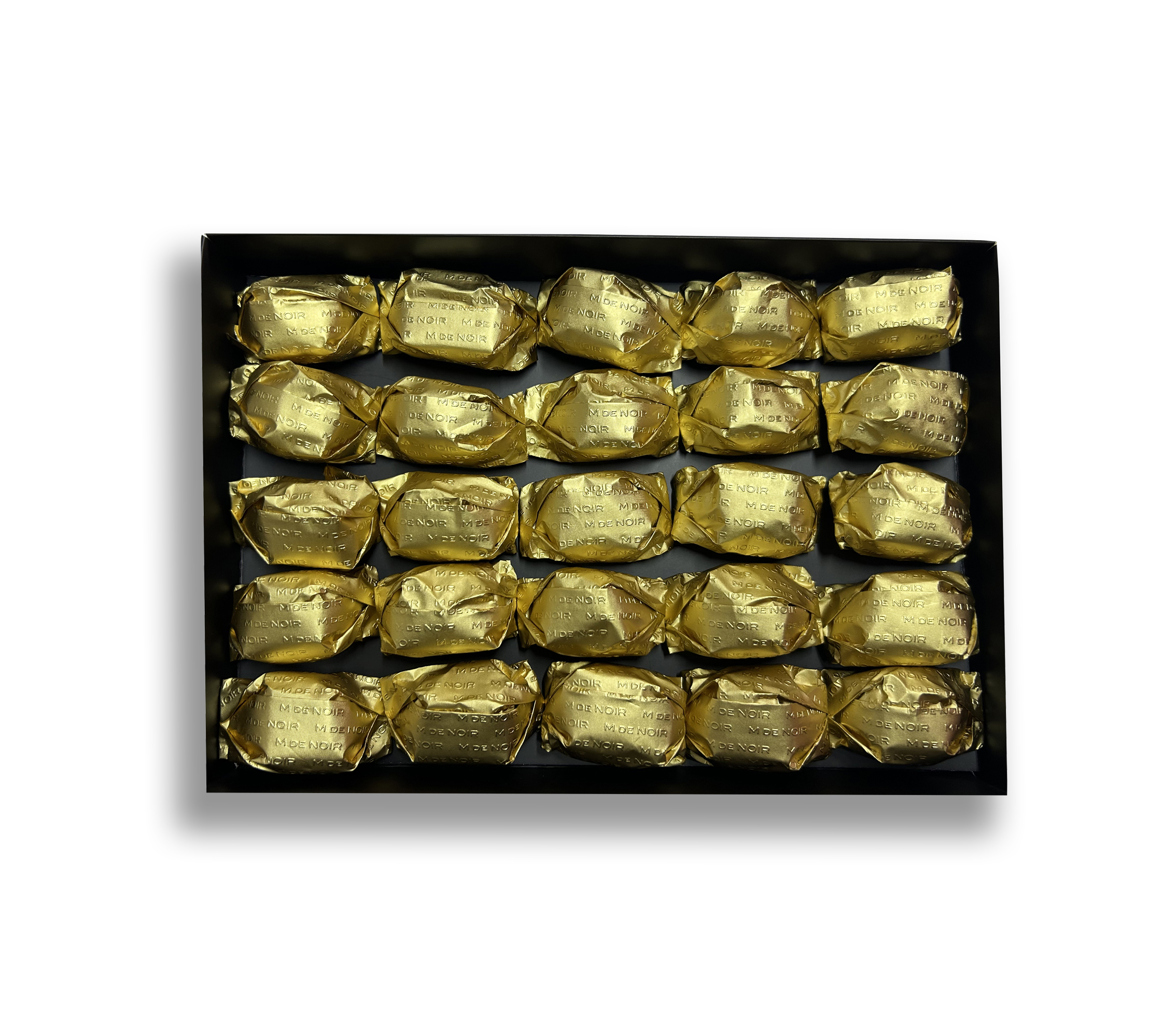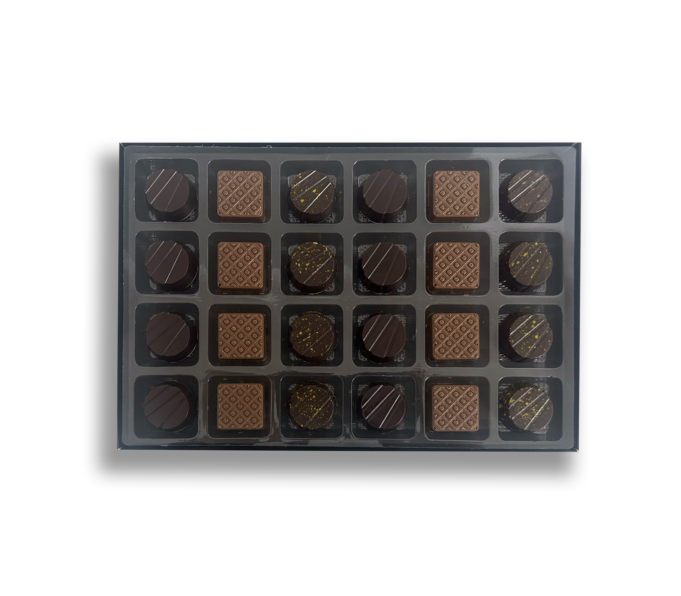 Maya Kanaan In Christmas LE NOIR 24 PIÈCES Boîte de 24 chocolats Le Noir en couverture noire 70% et lait. Disponible en boîte de 12 et 48 pièces.